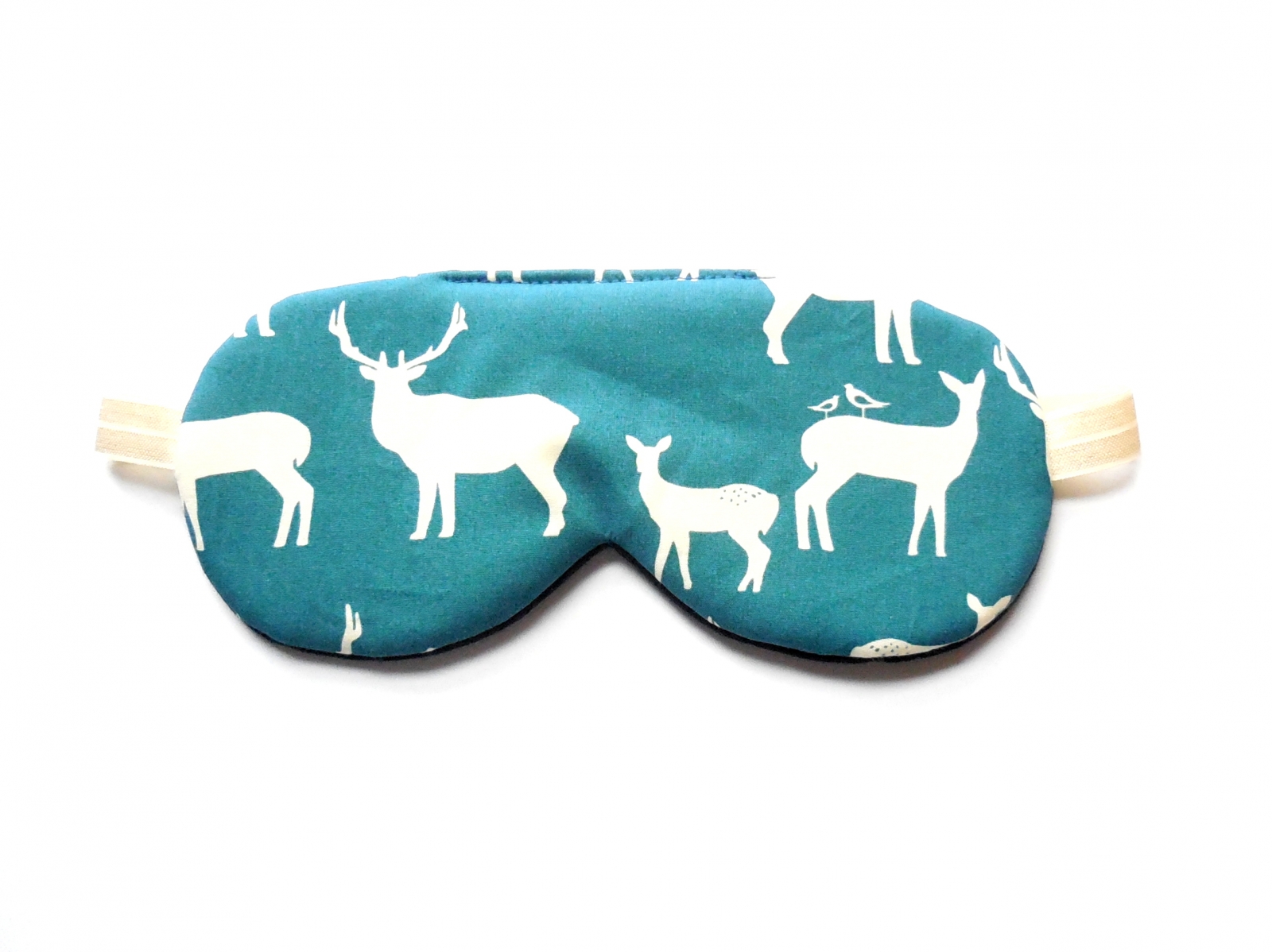 - Teal organic quilting cotton with a deer pattern is on the front side of this comfortable eye cover.